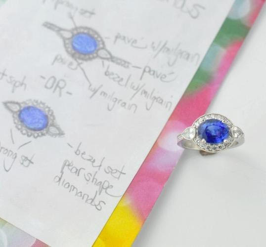 Which leads me to the story of our daughter, who turned 30 this year. I asked her what she wanted for her special birthday…her answer was a piece of jewelry made just for her…not too much pressure!. Let’s just say, over the years, our girl has definitely benefited from her parents line of work. Eight different original designs and her birthstone, Sapphire, was presented on her birthday so she could choose her favorite design, (it was one of my two guesses) and be part of the story. We did not disappoint her. Here’s the finished ring…perfection in every way. As our daughter received her ring, I was overwhelmed with heartfelt joy, knowing we created a family heirloom that will keep Rob and I alive for future generations, in the most fitting way I could possibly think of. Thank you Pam, for the inspiration. Remember to share the story…