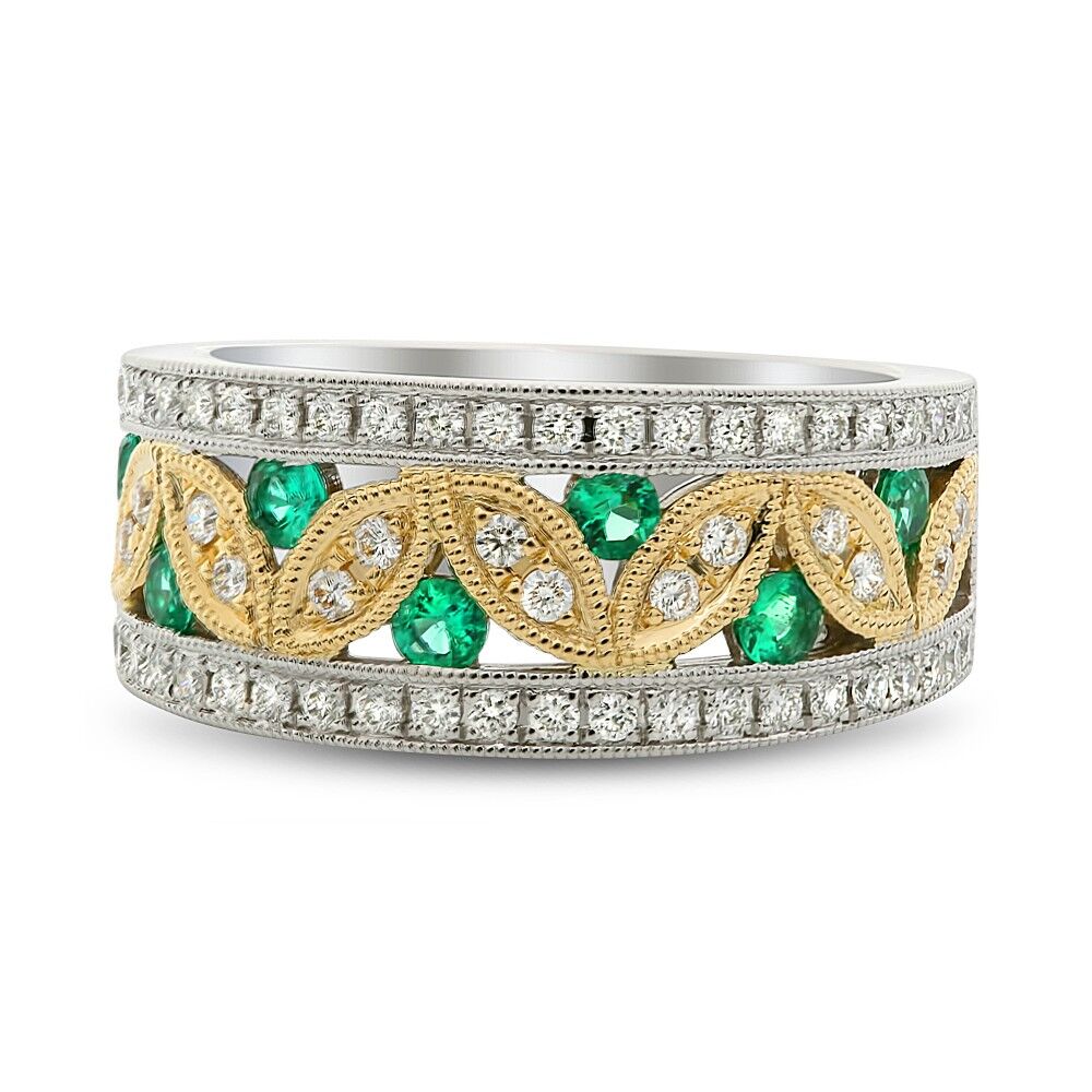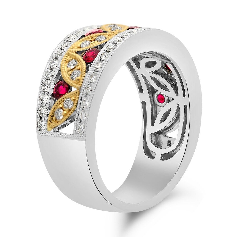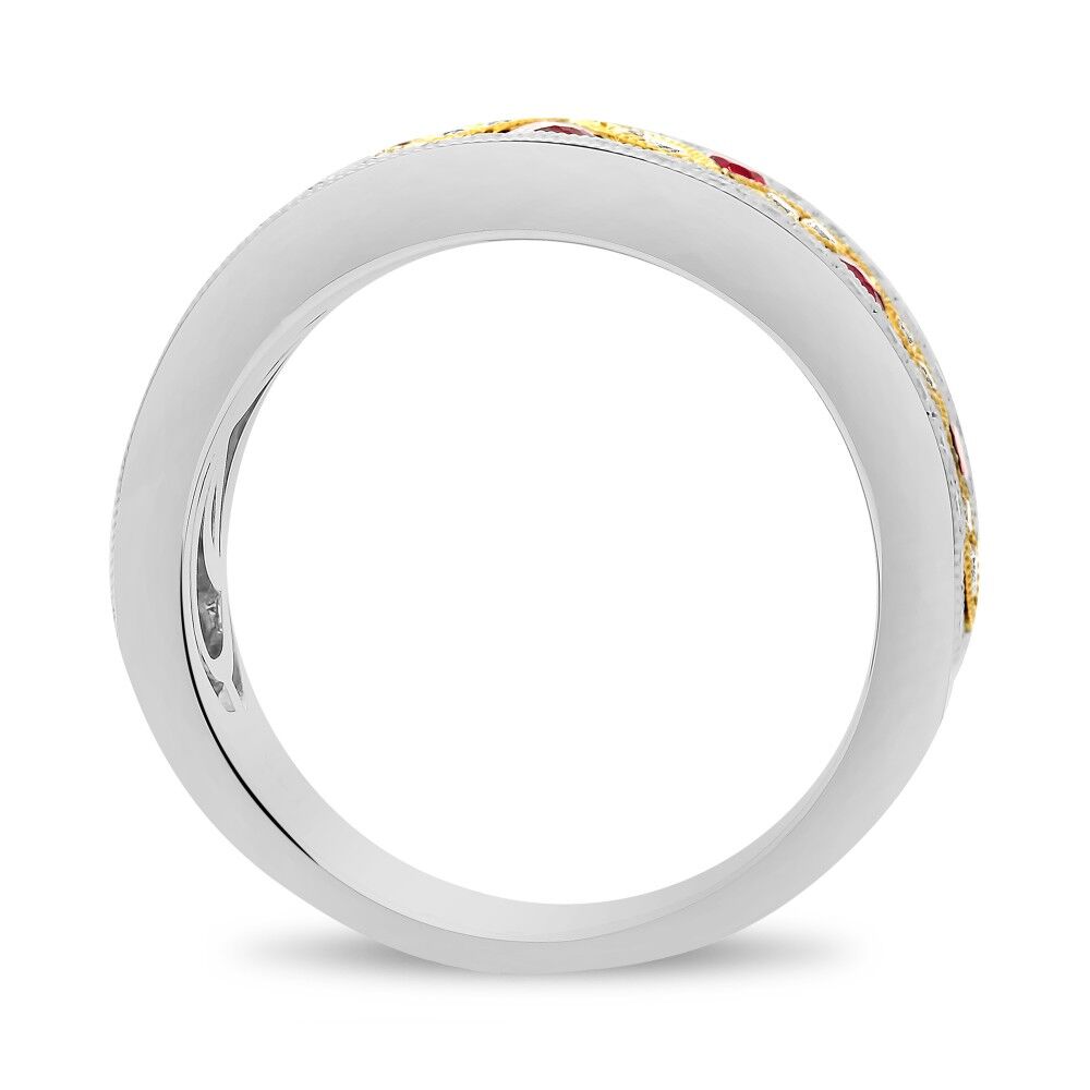 WHITE GOLD RUBY AND DIAMOND VINTAGE MOTIF BAND WITH YELLOW GOLD DETAIL