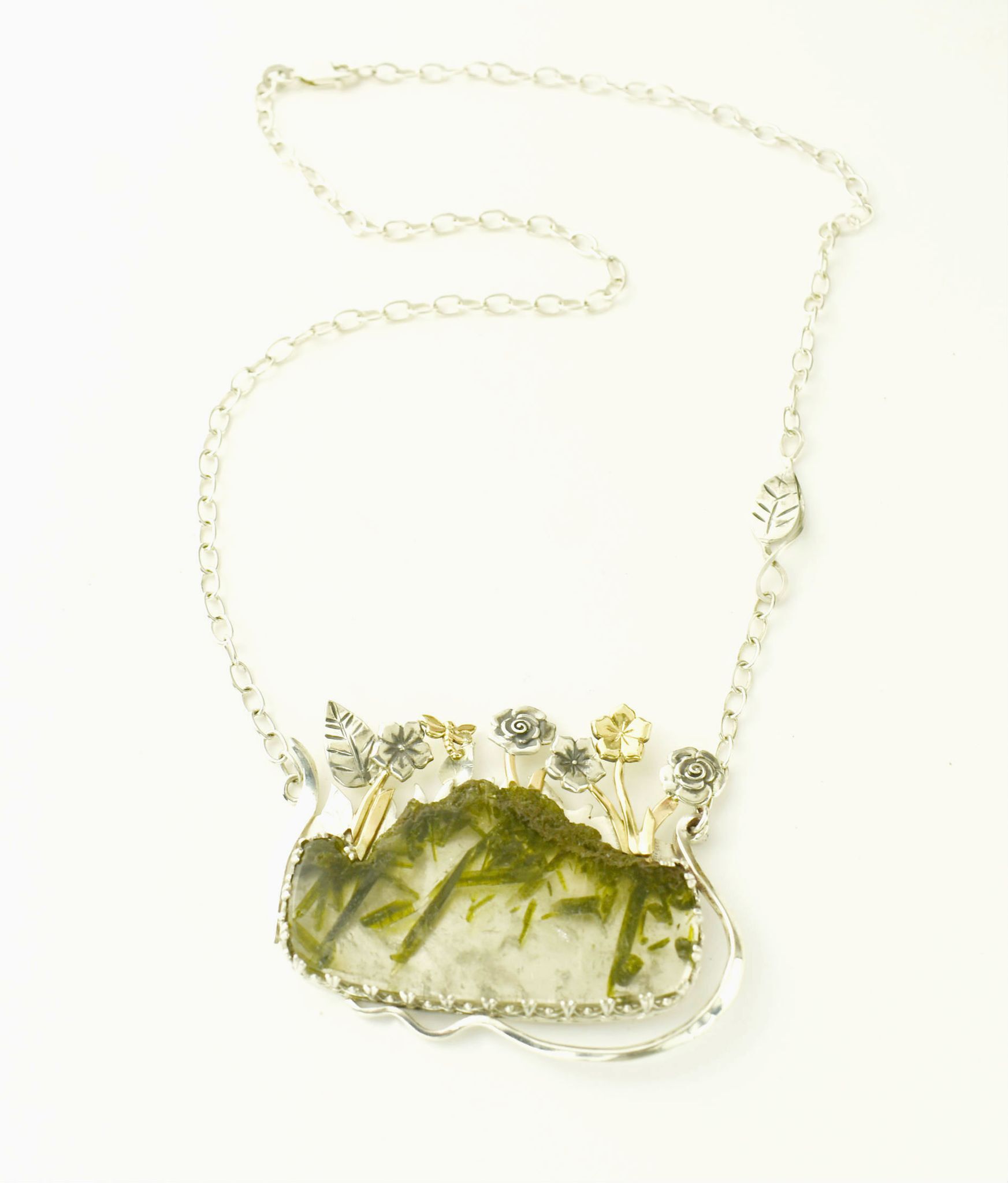 Sterling Sliver Garden Necklace with Sterling Silver & 14k Yellow Gold Flower and Leaves with a Epidote in Quartz Center Stone.
