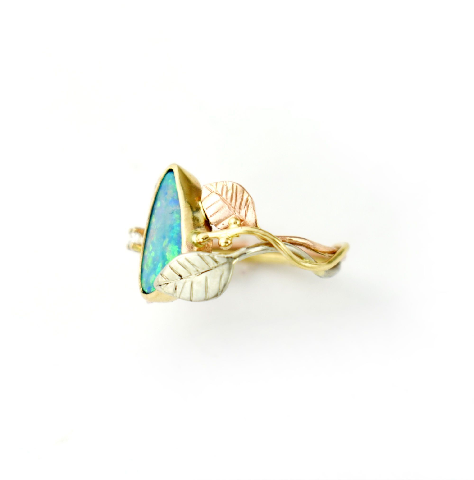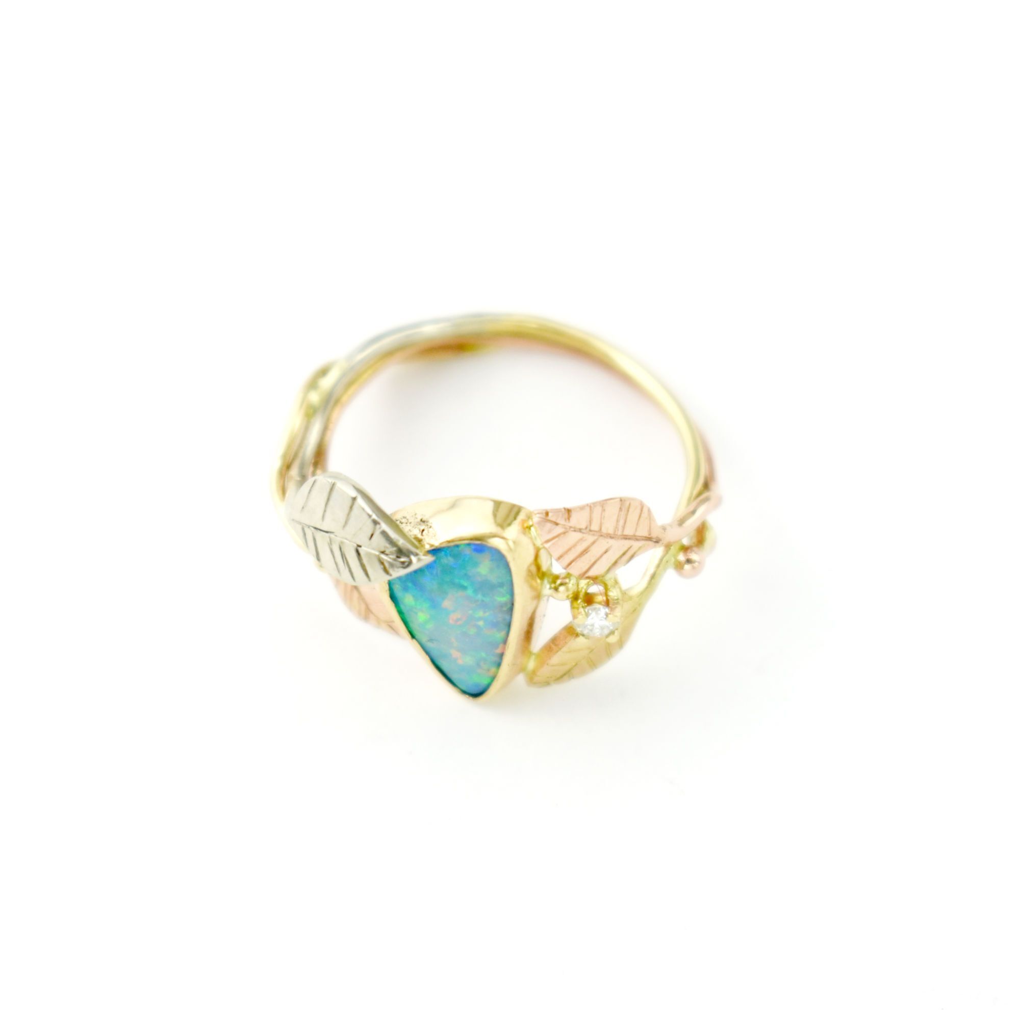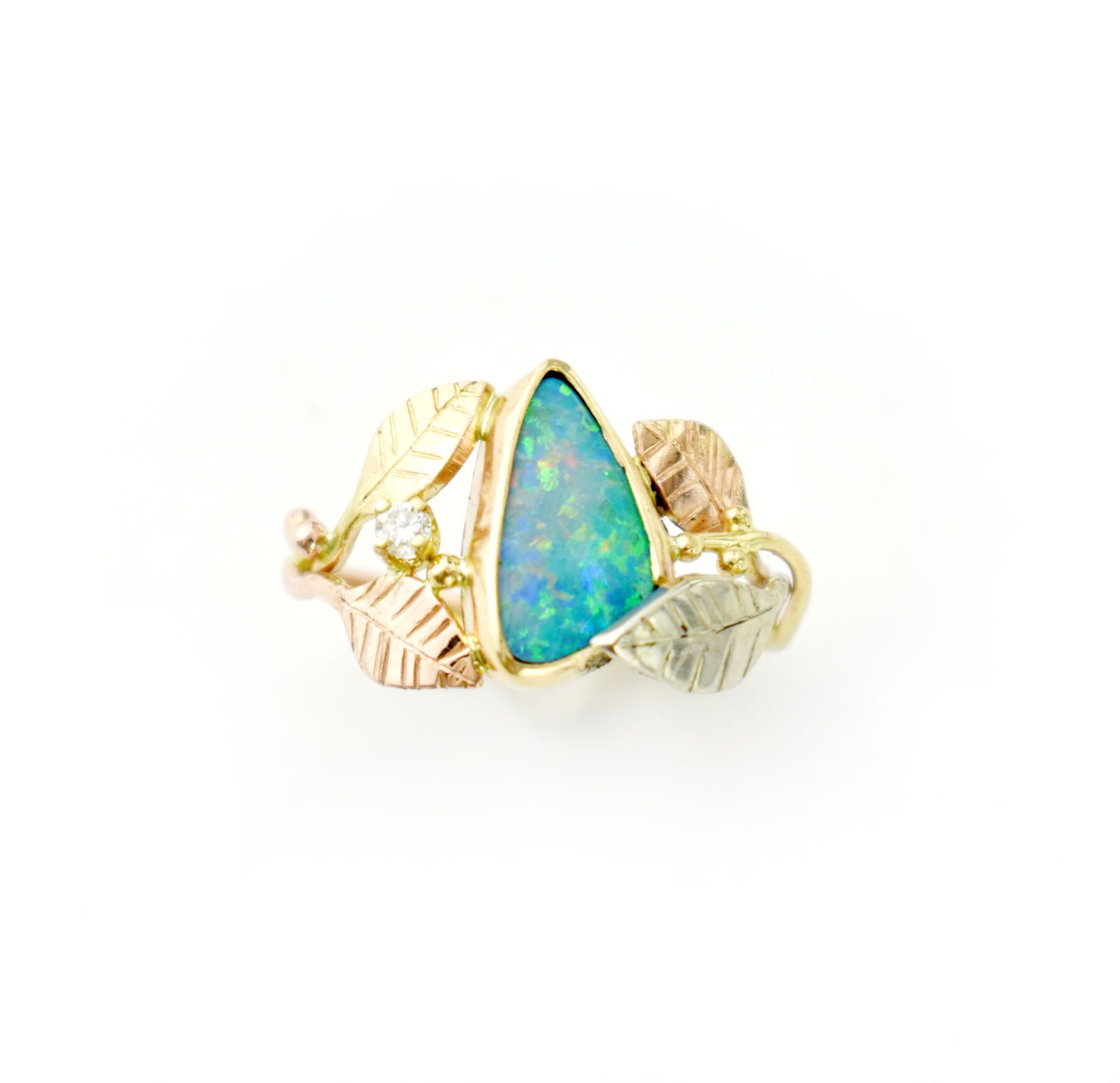 14k Tri-Color Gold Boulder Opal Doublet Ring with Diamond